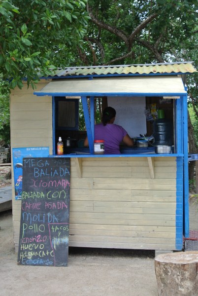Baleadas are a great affordable protein packed snack of tortilla, beans, cheese and onion (Baleada-sencilla). Sometimes you can get with egg or avocado as well, or meat and chicken. The basic baleada costs about 20-30 lempiras ($1-$1.40). There are stands located at the main intersection, at the Public Beach and another up the hill on Cola De Mico Road just before the Mango Inn.